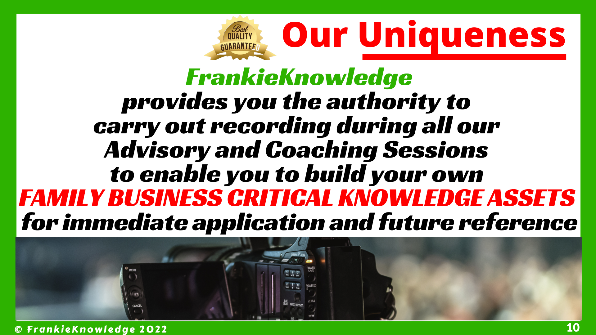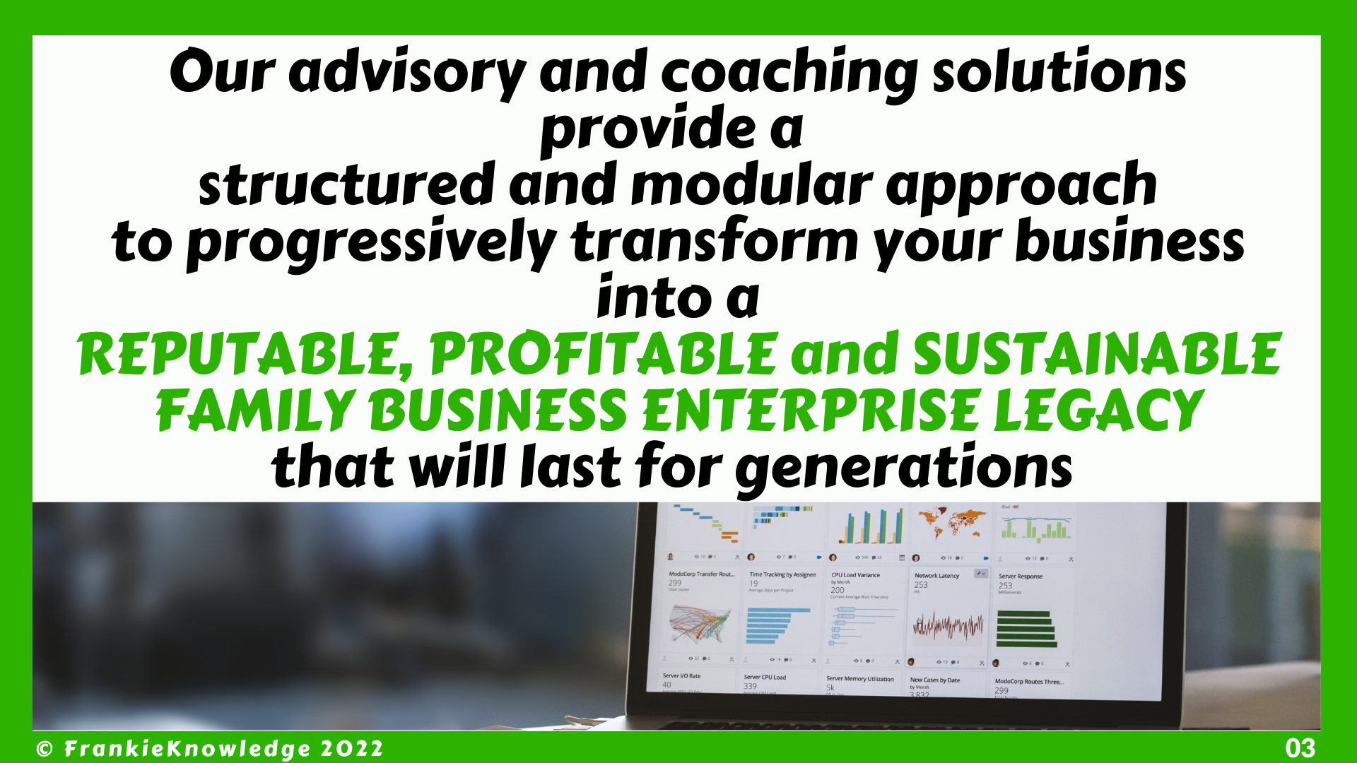 The FrankieKnowledge Family Business Enterprise Advisory and Coaching solutions provide a structured and modular approach to progressively transform the Business into a highly Reputable, Profitable and Sustainable Family Business Legacy that will last for many generations to come.
